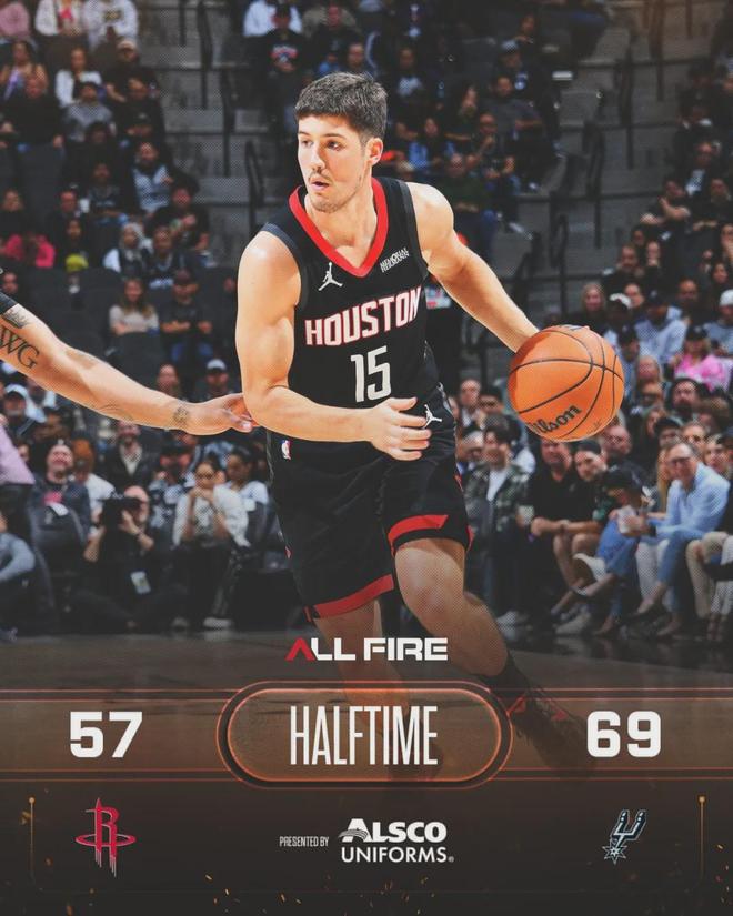 一旦杜蘭特在低位接到球,文班立刻從內(nèi)線出來,跟凱爾登一起夾擊杜蘭特。阿門-湯普斯被放空,沒有三分投射太致命了。上半場火箭全隊三分球15中4,三分命中率只有26.7%。馬刺榜眼哈珀爆發(fā),半場8中7高效砍下17分3助攻!